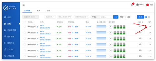 模板建立后,你需应用到你的那台矿机上,你的矿机就会按照你的规定,开始挖矿。我们点击主机列表 的三个点,选择配置并重启选项,选择你需要的模板并确定,矿机就开始工作了。