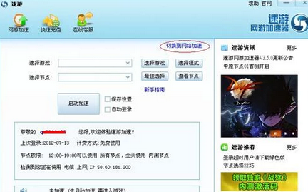 首先启动速游网游加速器,可以看到界面右上角显示的“切换到网络加速”;
