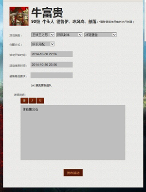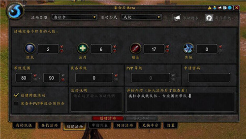 如果你有一颗指挥的心,更是可以自己创建活动。哪怕是奥杜尔成就龙团队,做橙斧需要黑ICC的碎片,在详情介绍里写明你的副本目的,让参与者更加明了团队目的。设置好坦克,治疗和DPS人员,更是可以不必纠结在一些副本某些BOSS中因为缺乏某些职业让团队停滞不前,还可以提出装等需求,在进击英雄本的路上将那些“菜鸟”拒之门外。组建好团队后开启语音,就可以去副本的“集合石”拉人开启冒险啦。