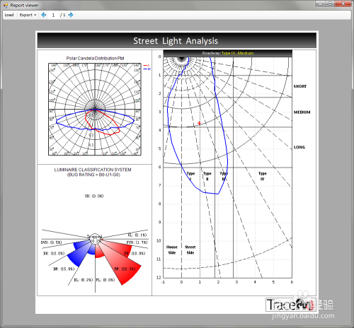 点击应用程式菜单中的“Analysis”,选择“Street Light”,所弹出对话框即为此路灯IES的类型分析报告。