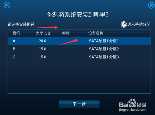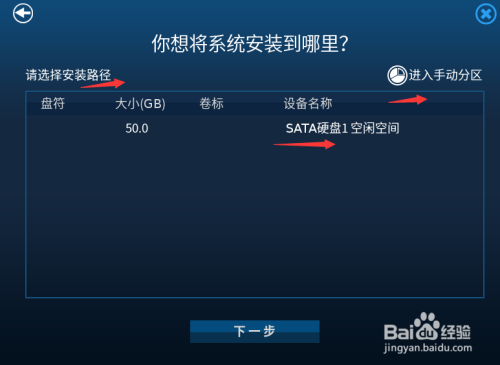 7.选择安装位置,可以选择任意刚刚创建好的磁盘。