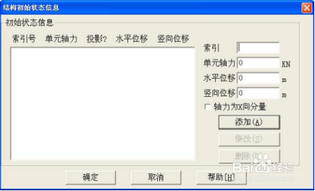 点击“初始状态信息”按钮出现如图。可以通过此窗口,给某些单元施加初始轴力、初始位移。