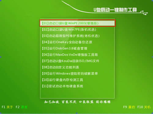 1.首先我们要把U盘制作成可启动U盘 ,具体步骤详情请看《口袋U盘PE之启动U盘制作方法 》,制作好之后我们设置BIOS中为U盘第一启动,具体的BIOS进入方法请参考《不同品牌主板、笔记本、台式电脑进入BIOS的设置方法 》,设置好之后进入口袋PE 菜单选项界面,我们选择第一项,等待进入下一个界面。