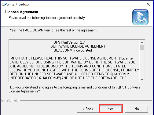 2、进入到qpst软件使用协议界面,我们点击界面下方的Yes(是)选项进入下一步。