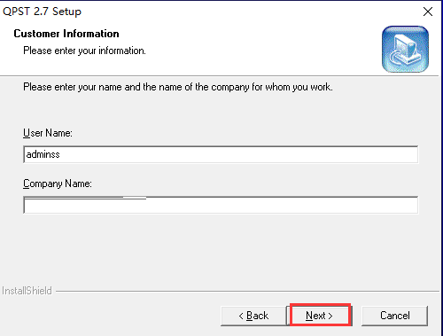 3、进入到qpst软件客户信息界面,你在该界面中可以输入user name(客户名)、compary name(公司名称),输入完成后就可以点击界面下方的next(下一步)。
