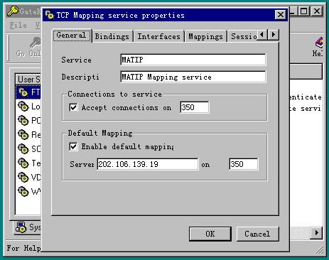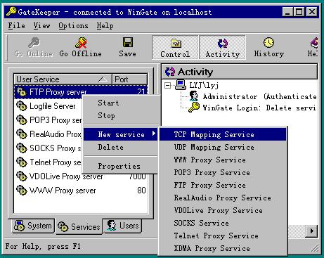 1、我们采用 WinGate3.02 进行了测试,使用 GateKeeper 在服务中添加 “TCP MAPPING Service”。如图: