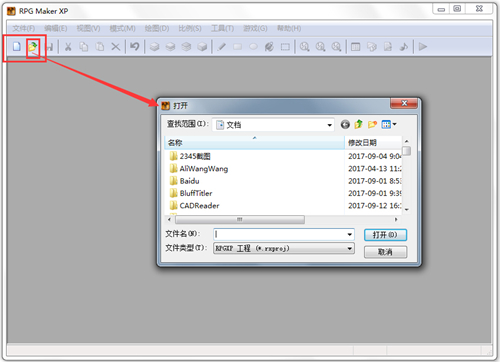 上面的工具也只亮着两个,第一个是新建工程,点击后就是下面的第一个窗口,标题就是游戏名建议和文件名一样,第二个窗口是储存的位置,下图有标志点哪里可打开。第二个图标打开工程。