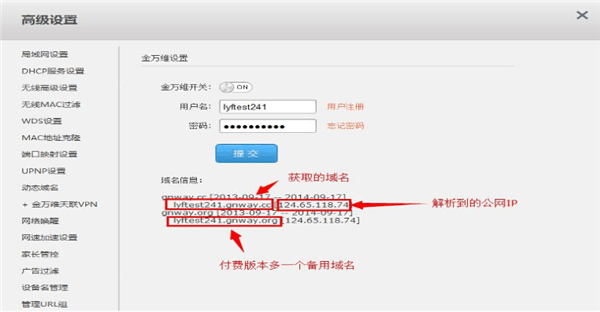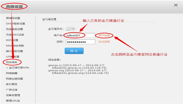第一步:点击“高级设置”,进入动态域名,使用您注册的金万维动态域名账号和密码登录,如果没有账号可以点击注册