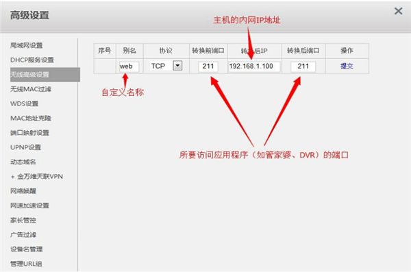 第三步:配置端口映射,将您要访问的系统(如管理软件、摄像头、DVR)的端口与主机(服务器或其他硬件设备)的内网IP建立对应关系