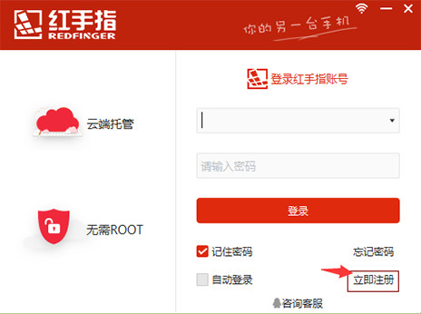 2.打开红手指软件,点击“立即注册”,系统自动跳转到注册界面。