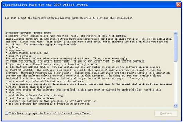 由于早期版本的 Office 不支持 Office 2007 的这种全新格式的文档,在没有安装 Office 2007 的计算机上打开这些 Office 2007 格式的文档会比较麻烦,安装了此补丁后,就可以直接打开Office 2007 格式的文档了.下载后在安装有 Office 2003 的计算机上直接安装这个工具即可,安装后即可在文件夹选项中看到已经添加了 .DOCX、.XLSX、.PPTX、.PPSX 几种常见的 Word、Excel 和 powerpoint 文档格式,并且可以用旧版的 Word、Excel 和 PowerPoint 打开这些新格式的文档文件了。