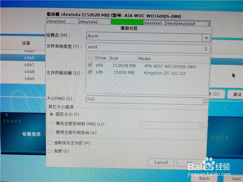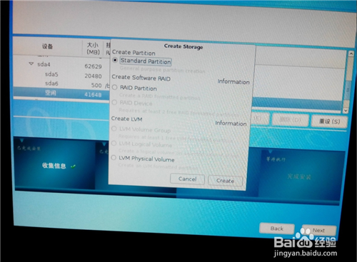 3、进入这个界面中,下拉找到你事先分出的空闲空间,选择“空闲空间”,点击“创建”,出现下面第二副图中对话框,默认标准分区,点击“create”,出现第三图中添加分区对话框,挂载点选/boot,文件类型选ext4,大小为500M,点“OK”,这样创建了一个boot分区。