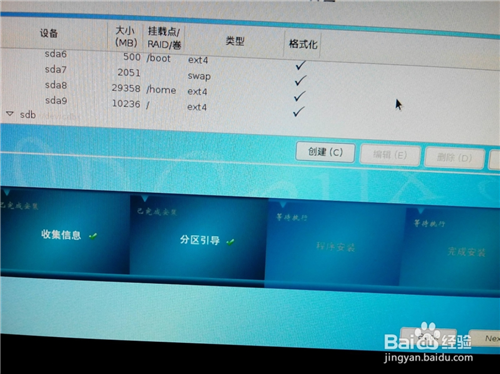 4、重复上述操作,创建/分区和/home分区以及交换分区swap,注意创建swap分区在文件类型下拉选择swap即可,如图。我创建的4个分区大致这样: