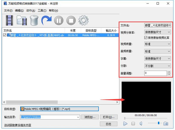 4、之后在右侧设置转换后的文件名和视频相关属性,并且在下方有一个视频预览窗口,可以浏览视频。
