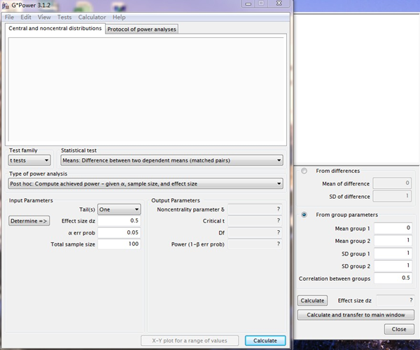 6、点Calculate and transfer to main window,计算出来的效应量值就出现在主窗口的Effect size dz处。