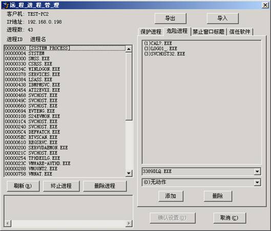 该窗口有“保护进程”、“危险进程”和“禁止窗口标题”三个栏目的设置,这些设置是对所有客户机有效的,选中与没选中的客户机都有效,即使没有连上来的客户机,下次客户机连上服务端后,这些设置也会自动生效。
