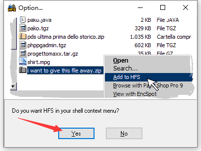 3、根据需要选择是否将hfs网络文件服务器相关功能添加到右键菜单,如果需要的话点击“Yes”即可。