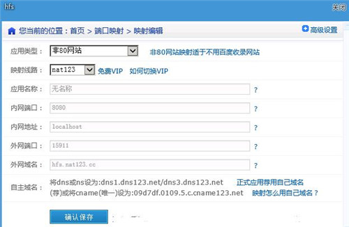 在内网HFS服务器本地或所在内网安装使用nat123并添加端口映射记录,使用非80网站类型,内网端口为HFS内网端口8080(如有修改则对应实际端口),外网域名可以默认提示的免费二级域名(或使用自己域名同时在自己注册域名解析商设置对应的CNAME指向),