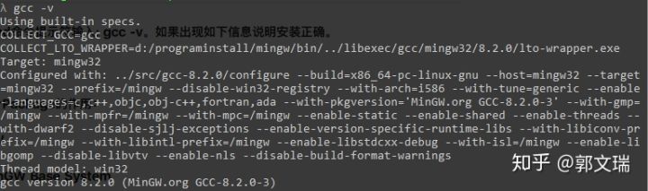 6.用cmd命令提示符输入: gcc -v。如果出现如下信息说明安装正确。