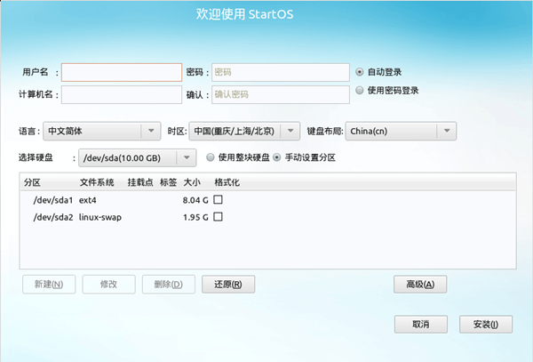 StartOS安装时,分享两种模式:快速安装和普通安装。前者一般只需要几分钟,是目前Linux发行版中安装时间最快的,但是消耗CPU和内存资源比较大,配置低的机器请选择普通安装。