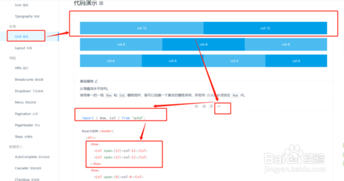 现在我们用 栅格布局组件作为示例,选择两列栅格布局,复制 import { Row, Col } from 'antd'; 这个引入组件的代码以及复制这个段 html 代码