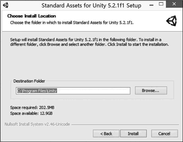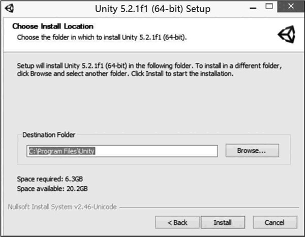 步骤11:进入ChooseInstallLocation界面,单击Browse按钮选择Unity资源的安装路径,默认安装在C:\ProgramFiles\Unity中,选好路径后单击Install按钮进行安装,如下图所示。