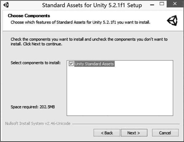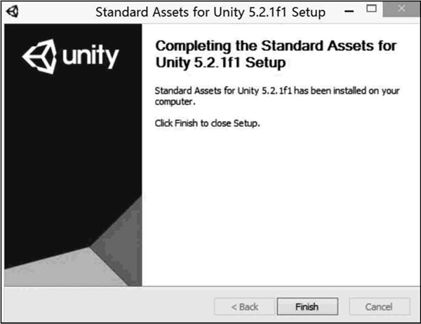 步骤7:当滚动条进到100%时将会转到Finish界面,单击Finish按钮。接下来安装Unity资源,双击UnityStandardAssetsSetup图标,如下图所示。