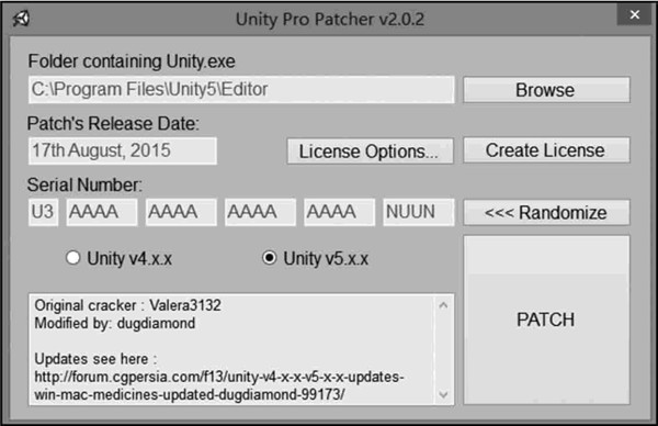步骤12:将Patcher置于安装目录的Editor文件夹下,右击该文件夹,以管理员权限运行,单击Browse按钮找到Editor文件夹,选择Unity5.0后,单击PATCH按钮,如下图所示。