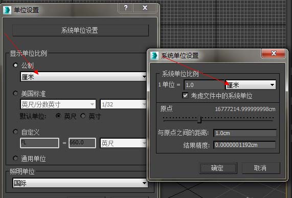 2、然后将显示单位和系统单位比例都设置成厘米,然后确定