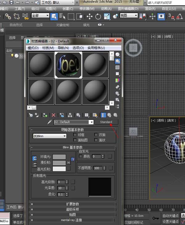 4、再给球一个材质,操作是按M键出现材质编辑器,漫反射选择位图,选择需要的纹理,然后点击在视口中显示。