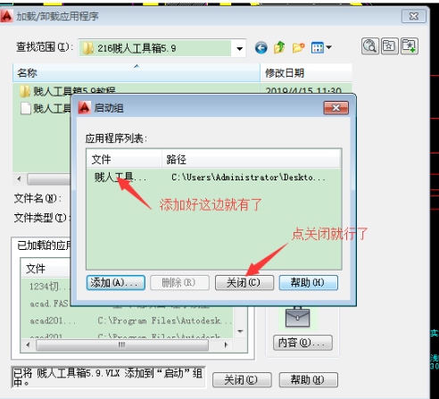 1、加载好后,只能单独使用,要想每次打开CAD都有这个加载程序,需要在启动组中也添加进去,在加载界面中点开“启动组”。同样把“贱人工具箱VLX”文件加载进去;