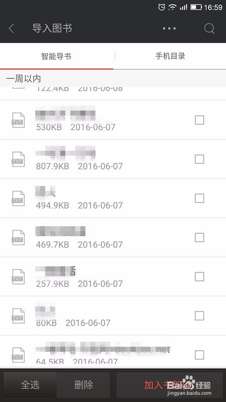 进入导入操作界面,这个读书应用会自动搜索手机内的文本文件,再显示出来,如下图: