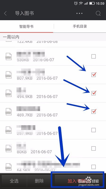 在想导入的文本后面,点击勾选,再点击【加入书架】,如下图: