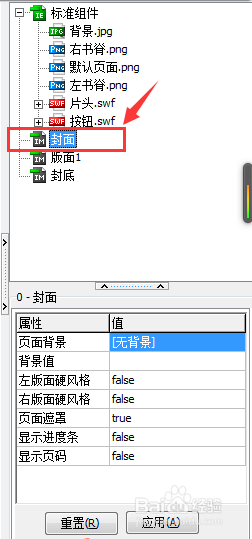 4、我们在“页面元素工具栏“选中封面这一项,然后可以看到下面的”属性工具栏“显示的封面属性,我们要做的就是自定义这些属性。