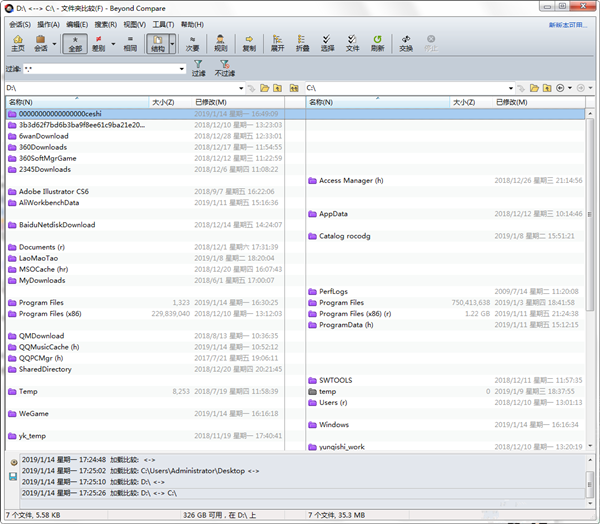 2、进入到Beyond Compare文件夹比较界面后选择你需要比较的两个文件夹路径地址即可开始比对。
