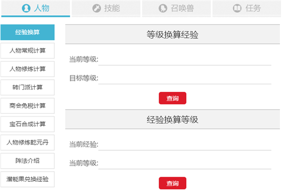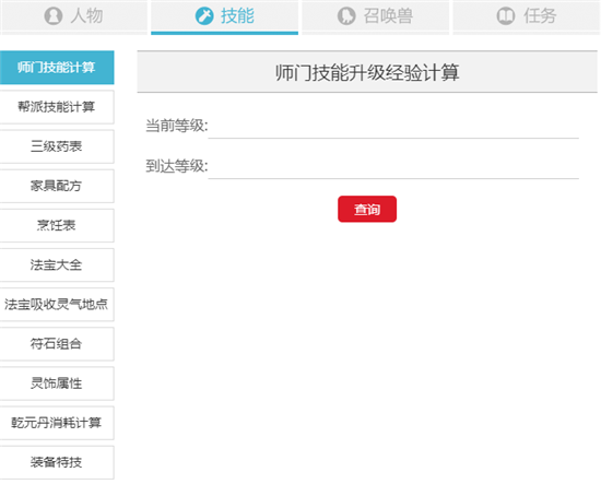 技能计算:包括0-180级师门技能所需经验金钱计算,帮派技能,辅助技能等。