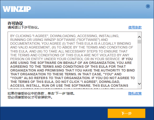 1、等待winzip中文版免费下载完成,双击软件安装程序打开安装向导,单击【下一步】